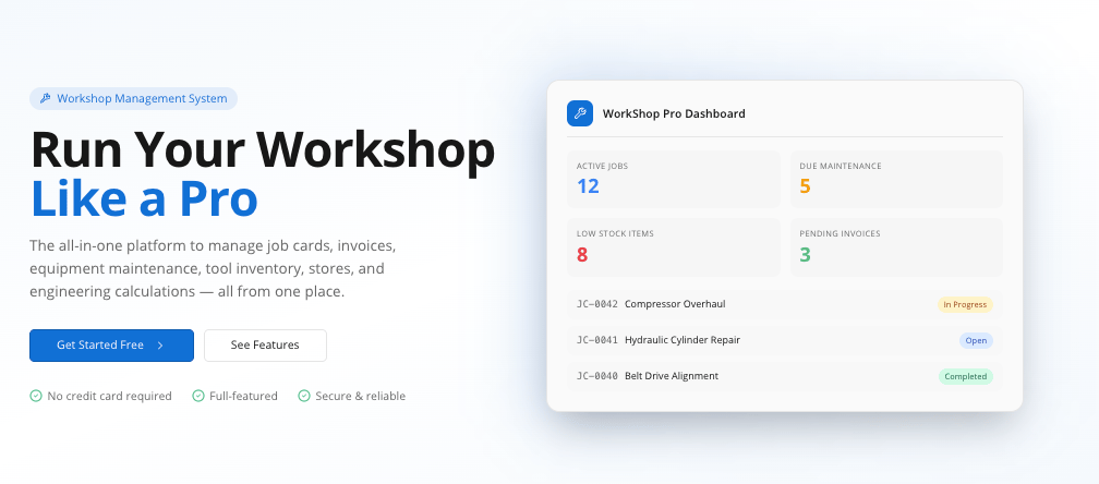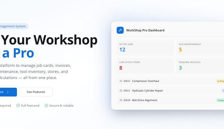Workshop Pro is a modern workshop management system built to help workshops stay organized, efficient, and in control. From equipment maintenance and tool calibration to stock management, job cards, customers, suppliers, and invoices, everything is managed from one practical dashboard.
